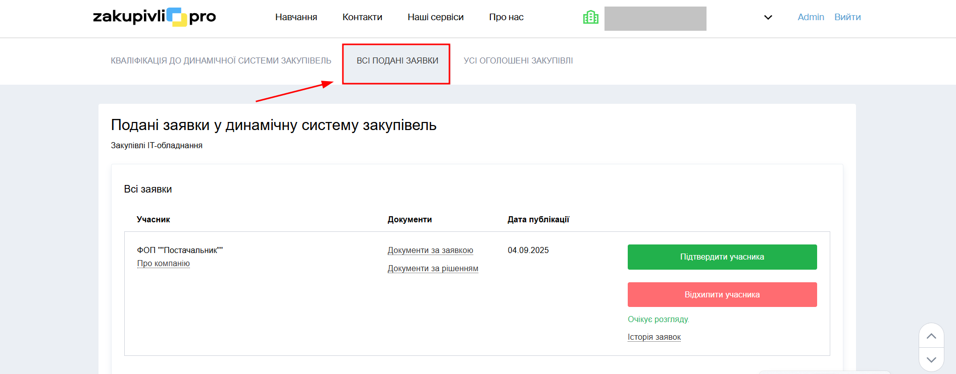 Після того, як постачальник подав заявку на кваліфікацію, ви побачите її на сторінці кваліфікації у розділі Всі подані заявки. Ви можете підтвердити або відхилити учасника, натиснувши на відповідну кнопку.