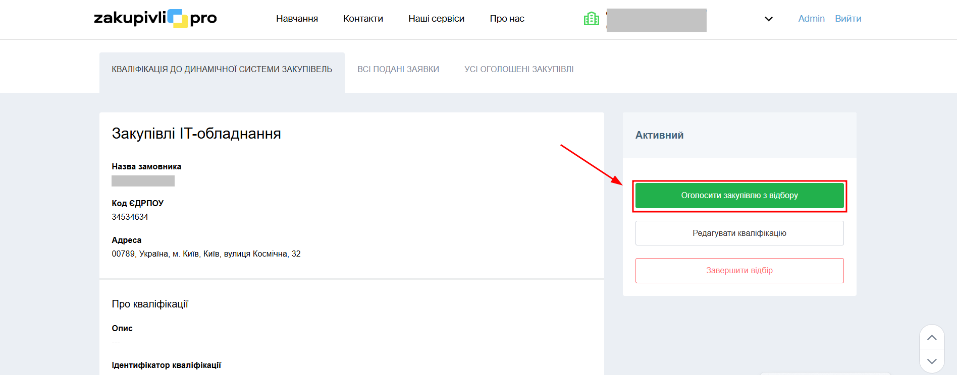 Ви зможете оголосити закупівлю з відбору після того, як ви кваліфікували 2 або більше постачальників. На сторінці кваліфікації з’явиться кнопка Оголосити закупівлю з відбору.