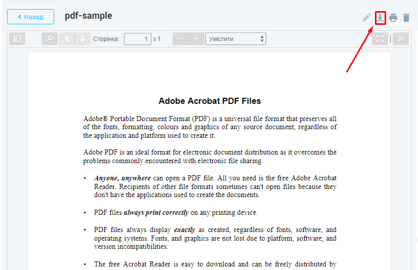 Відкрийте у сервісі “Вчасно” документ, в якому хочете перевірити достовірність накладених ЕЦП. В верхньому правому кутку над документом натисніть на значок збереження (документ збережеться в папку, яка вказана в налаштуваннях вашого браузера).