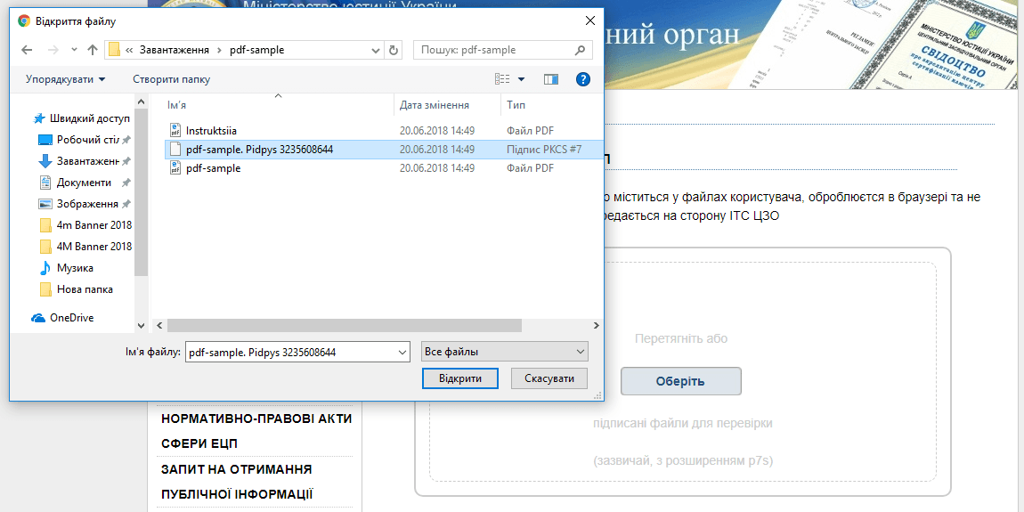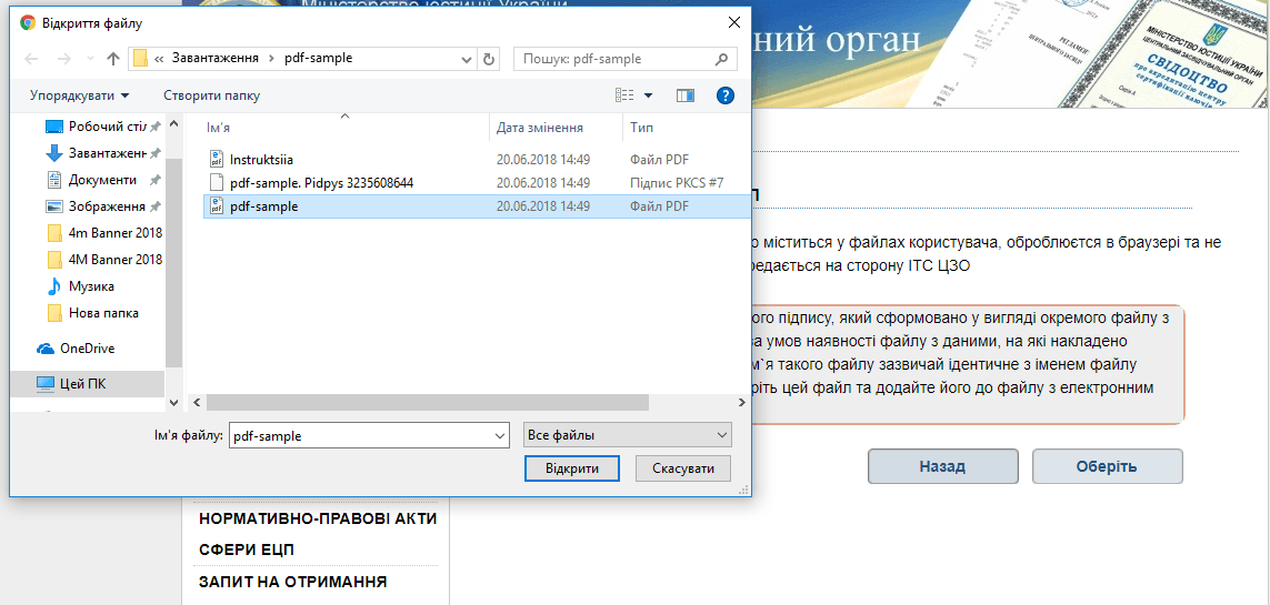 В новому вікні оберіть файл електронного підпису/печатки (попередньо збережені на комп’ютері) і відкрийте його.