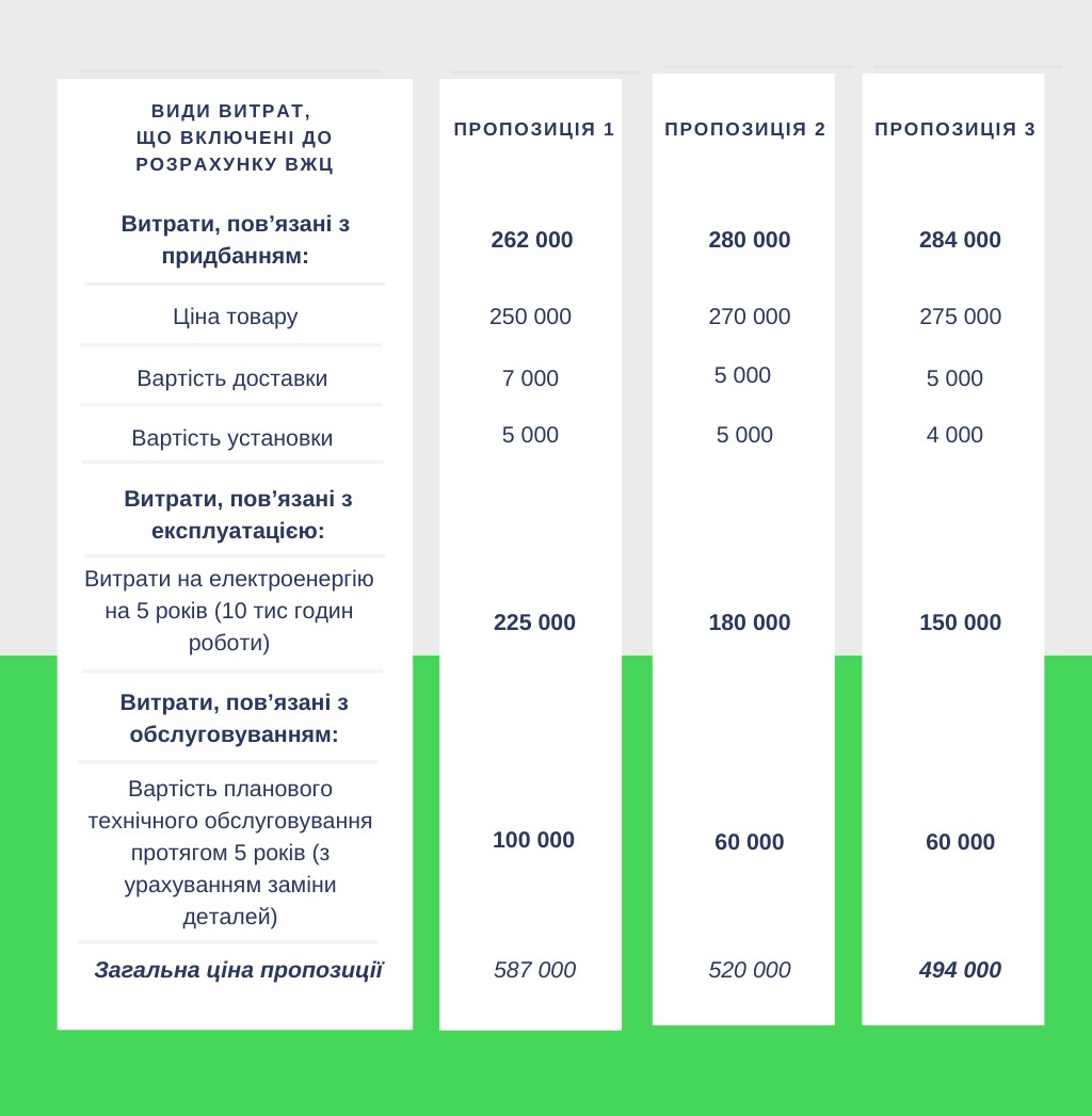 Отже, як бачимо з прикладу, завдяки меншим майбутнім витратам під час використання, найбільш вигідною буде ціна пропозиції № 3, хоч вартість самого приладу у цій пропозиції є найвищою.
