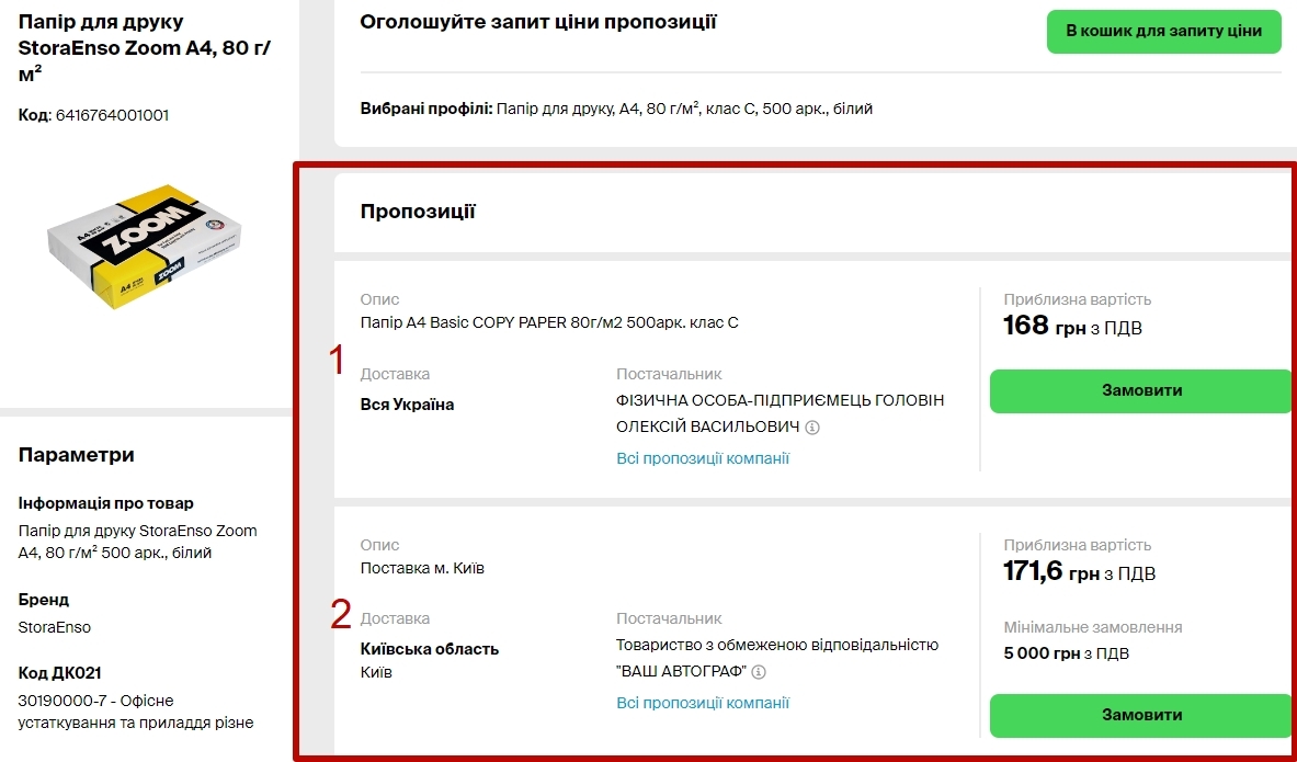 - закупівлі від 200 тисяч обов’язково проводяться шляхом запиту ціни пропозиції якщо в профілі товару є дві чи більше пропозиції від постачальників. Якщо пропозиція одна – можна закуповувати напряму через кошик без верхнього обмеження по сумі.