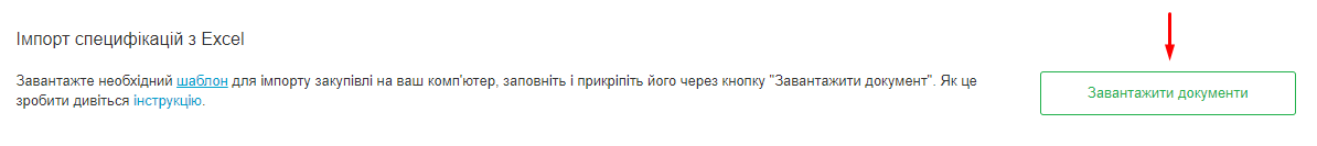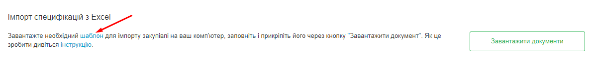 1. При створенні нової закупівлі у блоці “Імпорт специфікацій з Excel” натисніть на посилання, щоб завантажити шаблон.