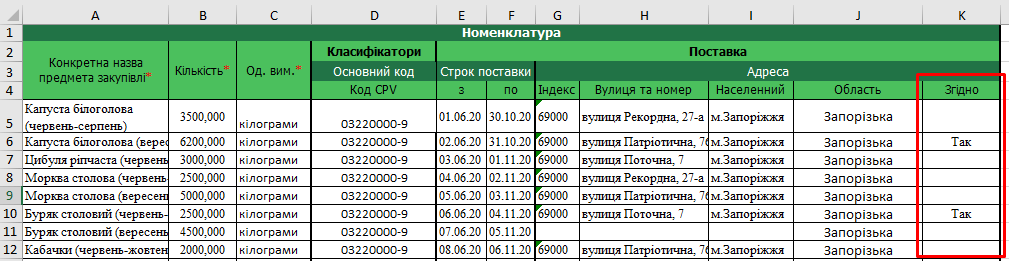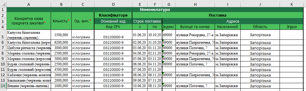 2. Відкрийте файл та заповніть шаблон своїми даними про закупівлю (по аналогії, як ви це робите на сторінці створення нової закупівлі). Наприклад: