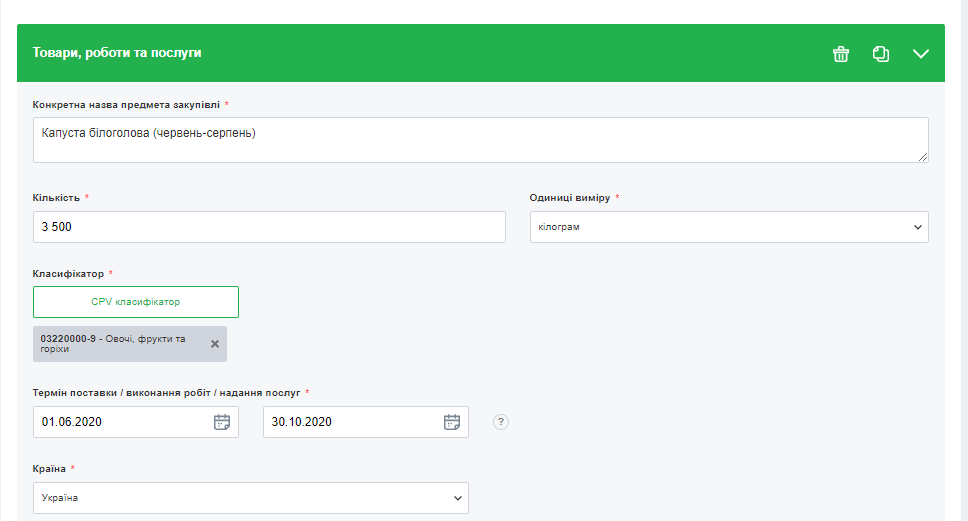 7. Якщо шаблон заповнений правильно, ви побачите, як усі поля в інформації про закупівлю автоматично набули тих значень, які ви вказали у шаблоні.