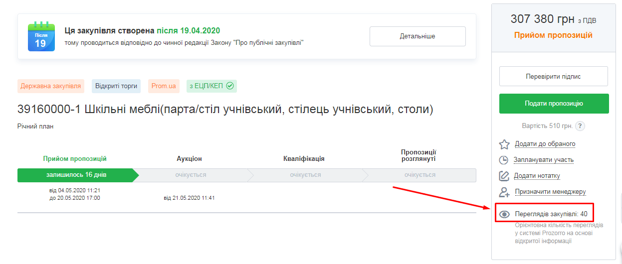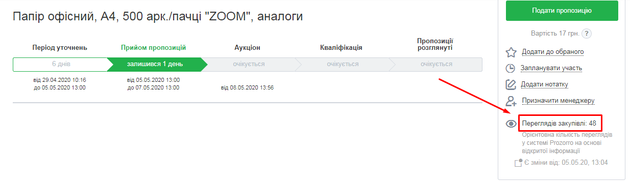 Для того, щоб приблизно оцінити, велика чи мала кількість переглядів вашої закупівлі, ви можете подивитися закупівлю аналогічного товару чи послуги за аналогічний період часу.
