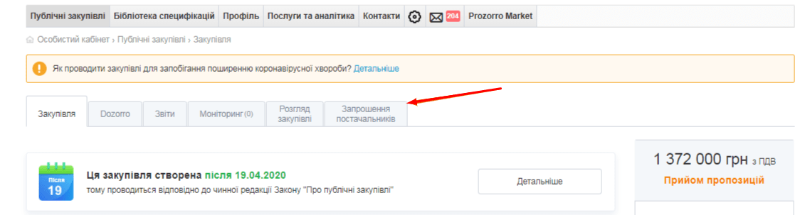 По-перше, якщо у вашій закупівлі недостатня кількість переглядів, ви можете додатково запросити постачальників, щоб підвищити конкуренцію. Для цього скористайтеся вкладкою “Запрошення постачальників”.