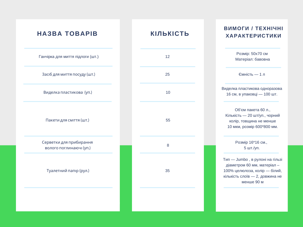 В тендерній документації сформуйте чіткий перелік необхідних господарських товарів, вкажіть одиницю виміру (штуки, упаковки та інш.), кількість кожної позиції та вимоги. Краще за все, це зробити у вигляді таблиці. Наприклад:
