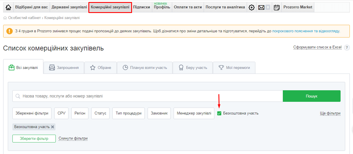 Наявність безкоштовних тендерів. На відміну від публічних закупівель у комерційних участь може буде безкоштовною. Щоб швидко знайти такі закупівлі, скористайтеся відповідним фільтром на майданчику Zakupivli.pro у розділі “Комерційні закупівлі”: