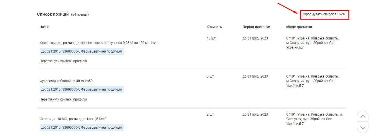 Для того, щоб вам було зручніше підготуватися до участі в ЗЦП з великою кількістю позицій, скористайтеся вивантаженням в Excel-таблицю. Для цього на сторінці ЗЦП натисніть Сформувати список в Excel (знаходиться над списком позицій).