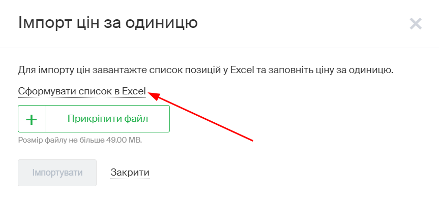 Для імпорту цін завантажте список позицій у Excel та заповніть ціну за одиницю. Для цього натисніть “сформувати список в Excel”.