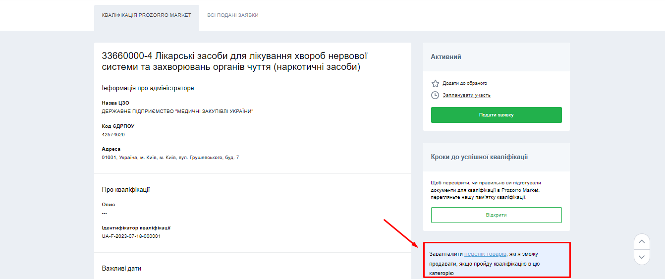 Ви ще не кваліфіковані в певну категорію товарів Prozorro Market, але бажаєте дізнатися, які товари зможете продавати, якщо пройдете кваліфікацію? Тоді просто завантажте перелік товарів. Посилання на нього знаходиться на сторінці конкретної категорії. Щоб вибрати конкретну кваліфікацію, перейдіть за цим посиланням.