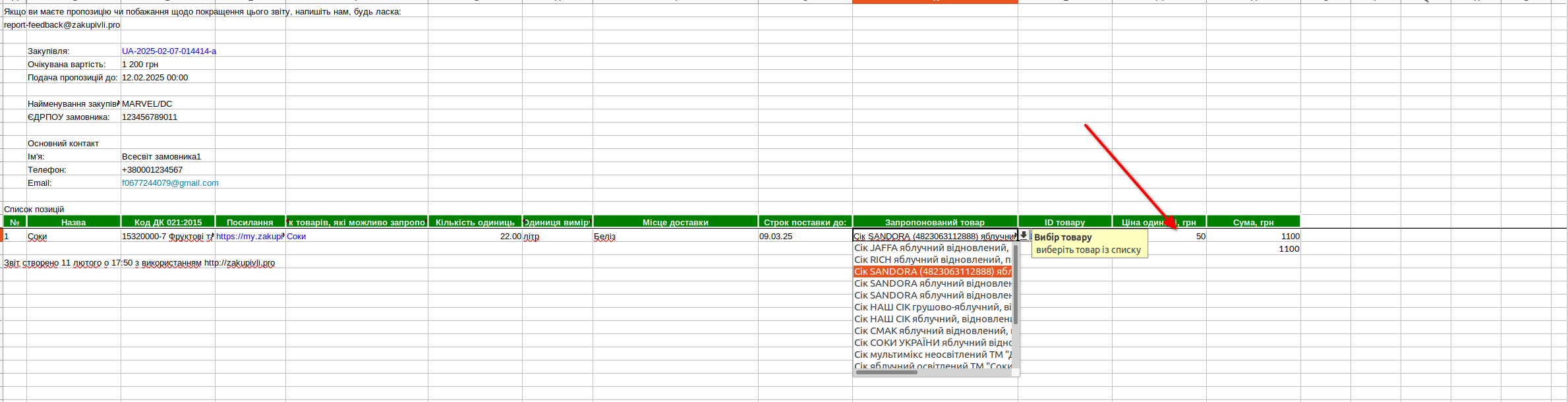 Після завантаження excel файлу ви обираєте необхідний вам товар у стовпці “Запропонований товар” і виставляєте ціну за одиницю. Сума автоматично підрахується з урахуванням кількості одиниць та ціни за одиницю у відповідному стовпці. Можна заповнити не всі позиції, тоді імпорт відбудеться частково.