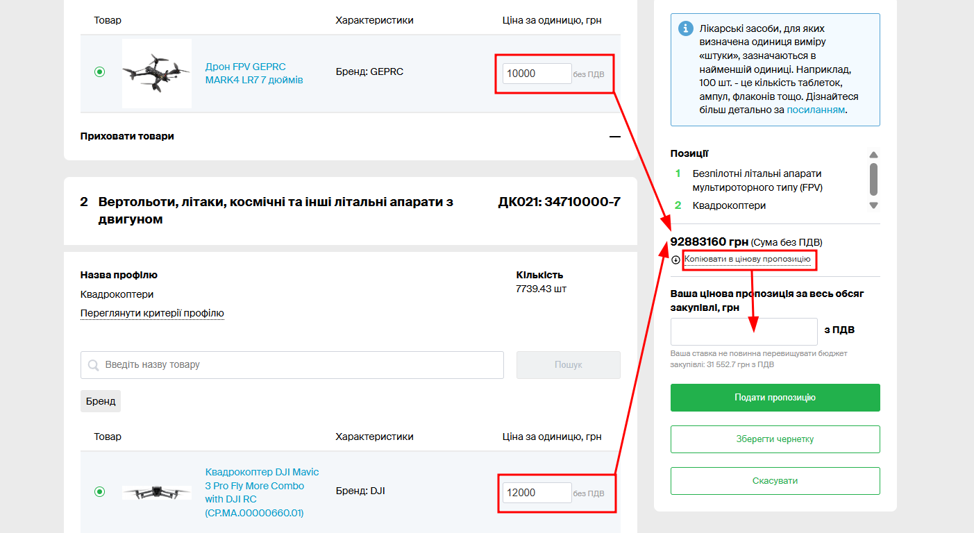 Якщо ви подаєте пропозицію до закупівлі з декількома позиціями, то система просумує добуткі по кожній позиції. Також ви можете натиснути Копіювати в цінову пропозицію, і ця сума з’явиться в полі Ваша цінова пропозиція за весь обсяг закупівлі, грн.