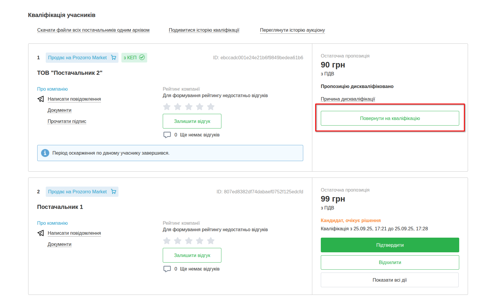 До моменту завершення закупівлі у замовника в кабінеті біля дискваліфікованого учасника буде наявна кнопка ”Повернути на кваліфікацію”.