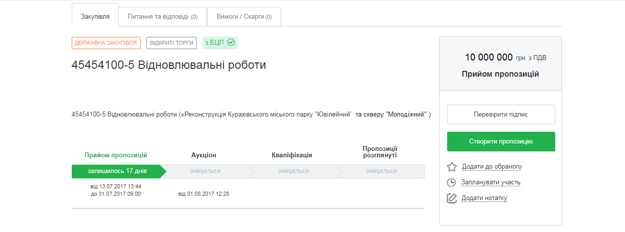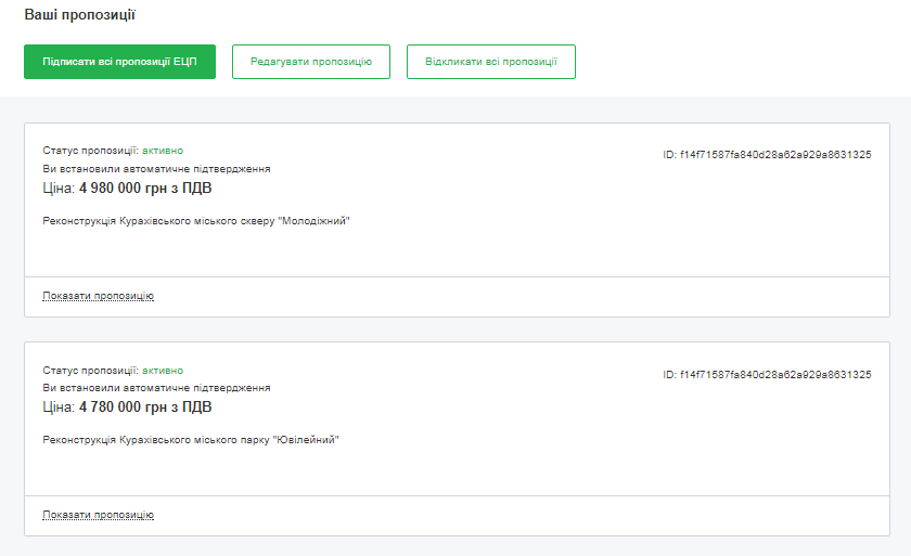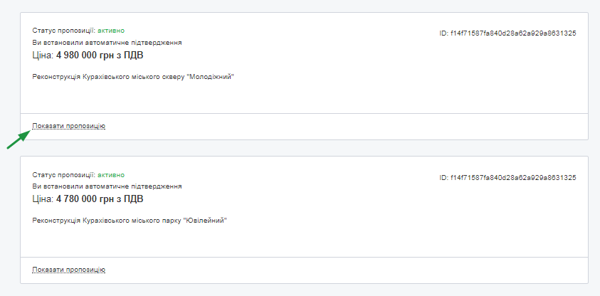 Пропозиції в кожний лот можна переглянути, натиснувши на посилання “Показати пропозицію”.