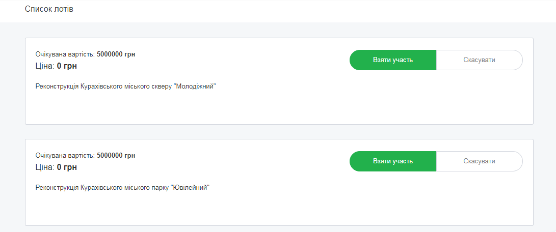 Переходимо до списку лотів та натискаємо кнопку “Взяти участь”.