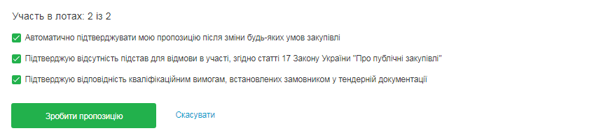 На завершення підтверджуємо відсутність підстав для відмови від участі та відповідність кваліфікаційним вимогам, поставивши відмітки в чекбоксах. Залиште відмітку в чекбоксі про автоматичне підтвердження пропозиції. Якщо замовник внесе незначні зміни, пропозицію буде автоматично підтверджено. Проте, якщо замовник значно зменшить бюджет закупівлі чи валюту, пропозицію буде неможливо автоматично активувати. У такому разі вам на пошту надійде лист з проханням активувати пропозицію вручну.