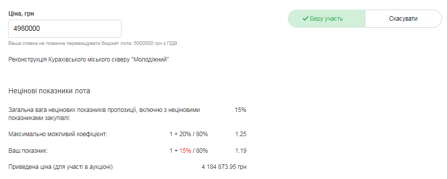 Вказуємо ціну пропозиції, яка має не перевищувати очікувану вартість лота.