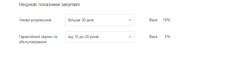 Якщо закупівля передбачає наявність нецінових критеріїв, загальних для всіх лотів, оберіть необхідне із вказаних опції. Обрані показники буде додано до пропозиції у всі лоти.