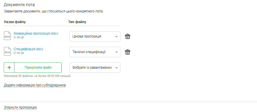 Завантажуємо документи, які стосуються виключно цього лота. Такі документи буде відображено виключно в пропозиції до конкретного лота. Додаємо інформацію про субпідрядника у разі необхідності.