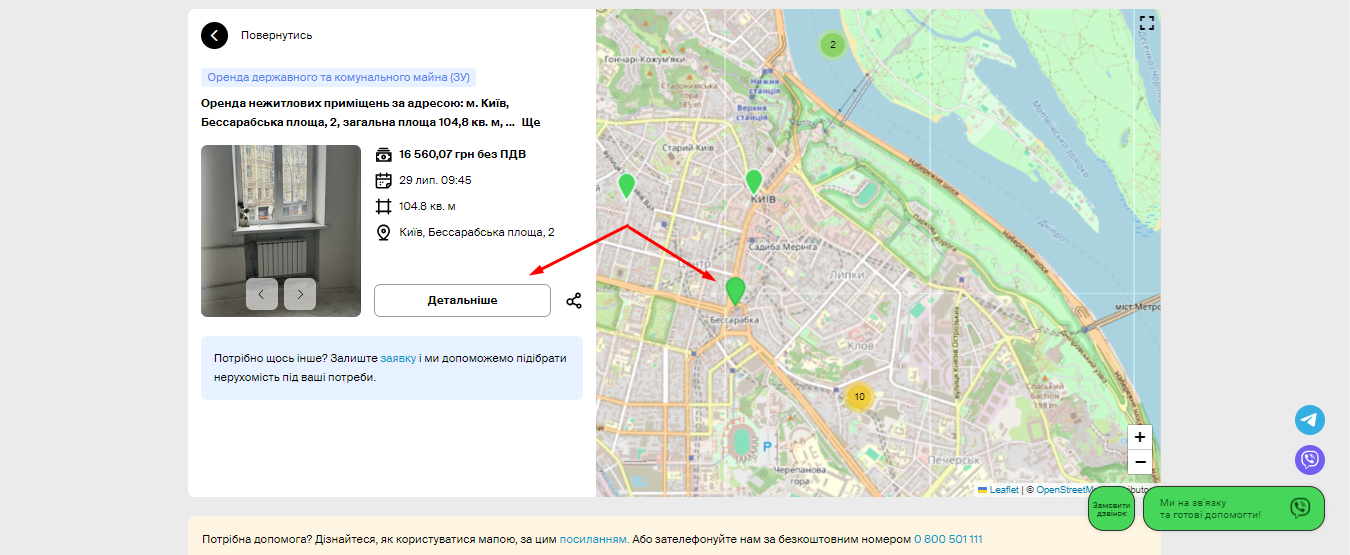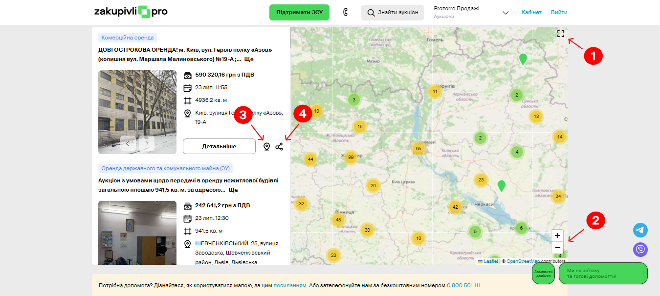 - У списку лотів біля кнопки Детальніше є іконка, щоб показати на мапі конкретний лот – позначка 3 на скріншоті