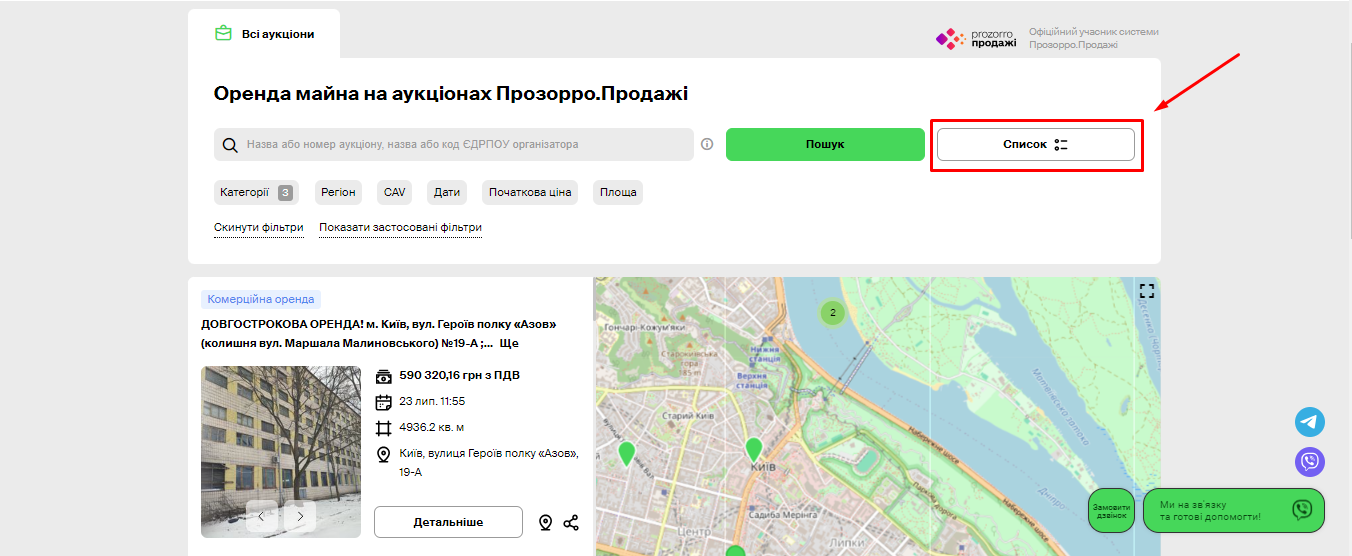 За потреби ви можете відобразити список аукціонів без мапи – для цього натисніть на кнопку Список. У списку доступний фільтр Статус, за допомогою якого можна подивитись аукціони не тільки на етапі Прийом пропозицій (як на мапі), але й в інших статусах.