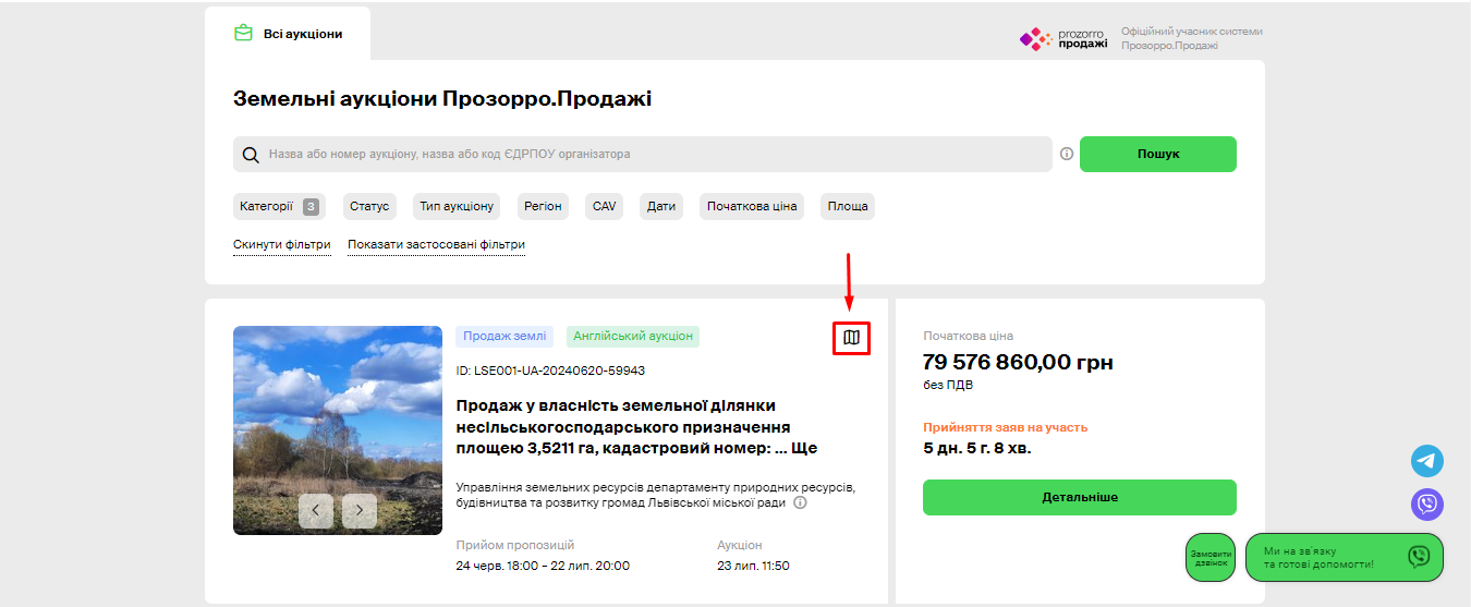 Розташування конкретних лотів на мапі – це клікабельні елементи. Якщо натиснути на якусь позначку на мапі, то у списку аукціонів ви побачите інформацію щодо цього лота.