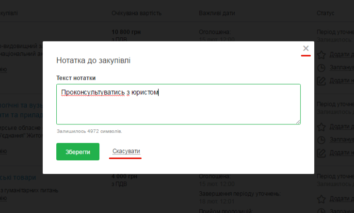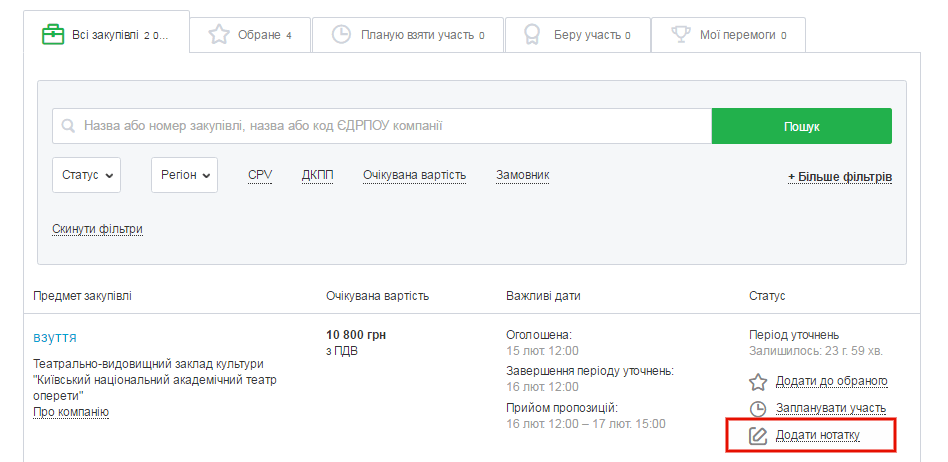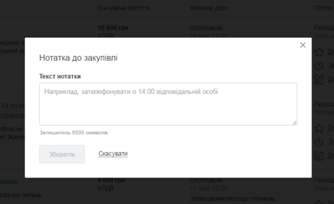Додати нотатку можна відразу зі списку закупівель або безпосередньо на сторінці закупівлі: