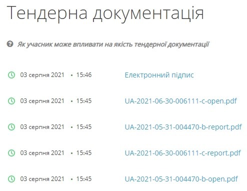 Також існує технічна можливість завантажити такі документи при публікації закупівлі або при підтвердженні переможця. Якщо замовник обирає перший варіант, то на веб-порталі Prozorro ці файли відображатимуться в розділі «Тендерна документація»: