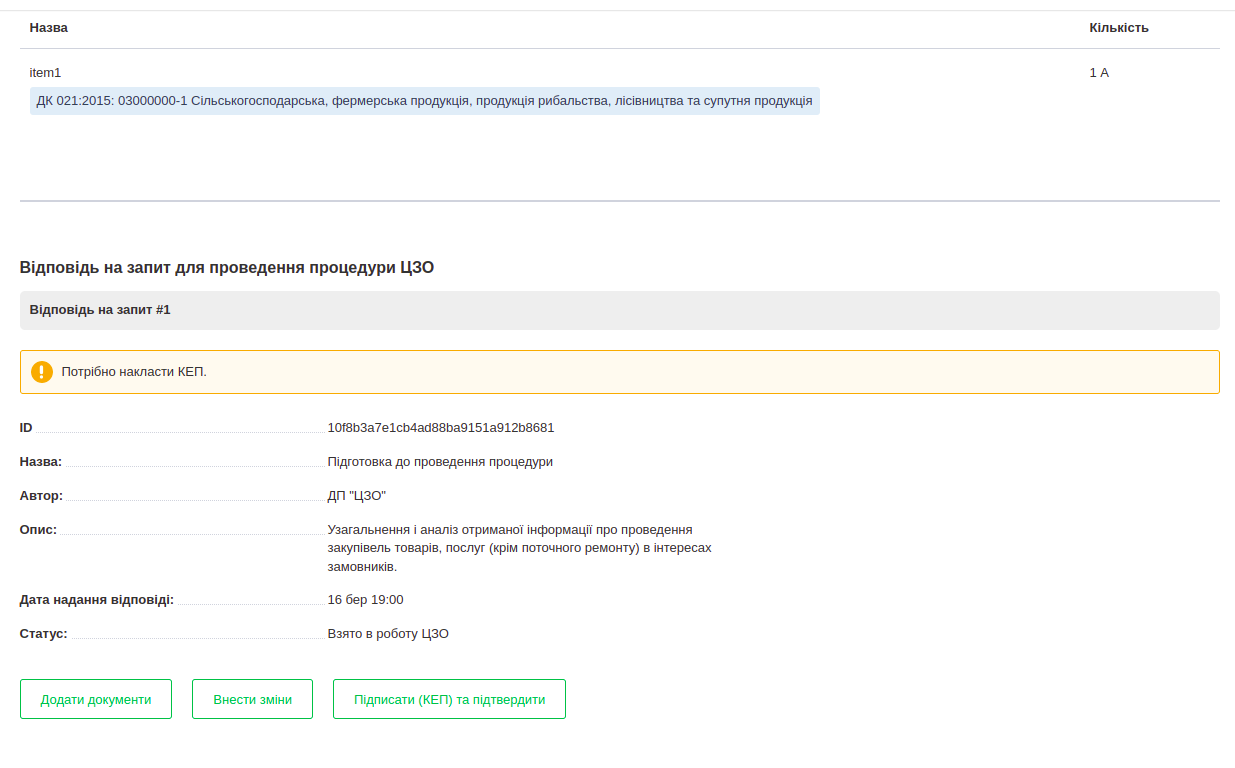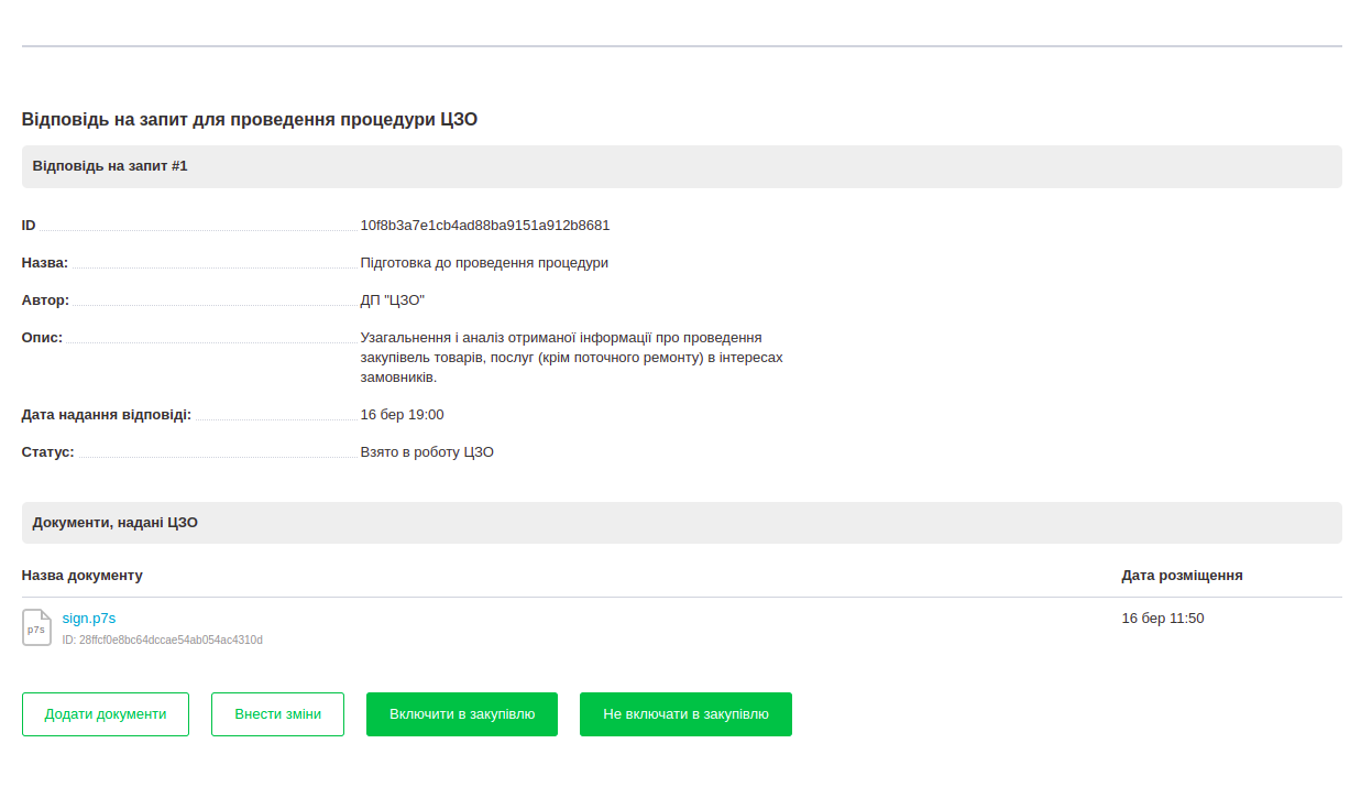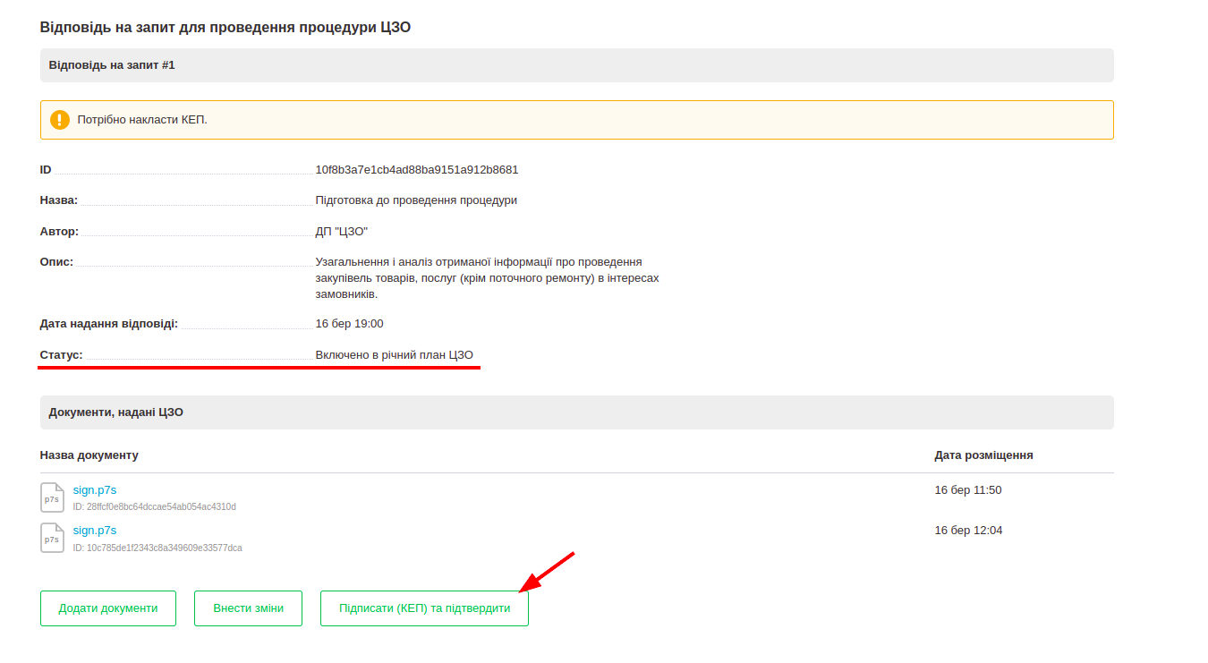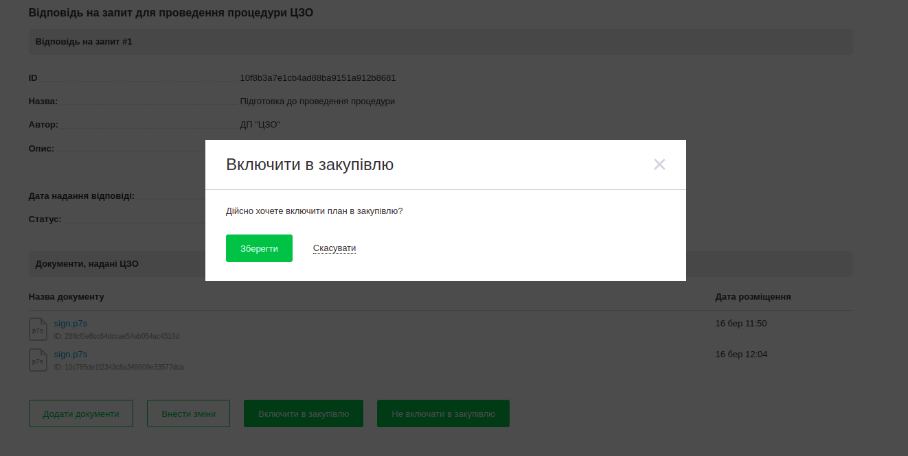 Якщо план замовника погоджено, натисніть на “Включити в закупівлю”, підтвердіть дію в додатковому вікні. Статус відповіді змінюється на “Включено в річний план ЦЗО”. Дія підтверджується КЕП.