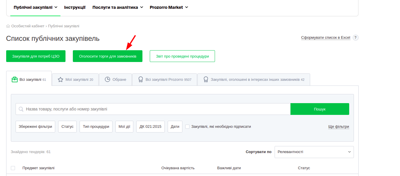 Якщо необхідно створити закупівлю для своїх потреб, то використовуйте кнопку “Закупівля для потреб ЦЗО“