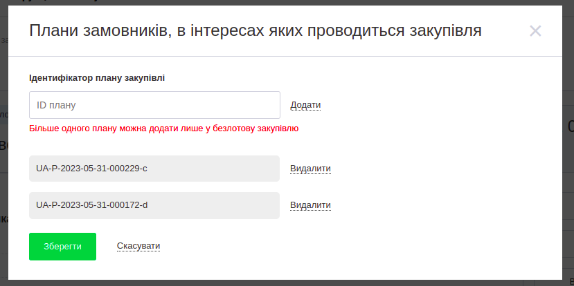 Для агрегованої закупівлі (закупівля для декількох замовників) неможливо опублікувати мультилотову закупівлю (два і більше лотів). У такому випадку при спробі додати два і більше планів з’являється повідомлення “Більше одного плану можна додати лише у безлотову закупівлю”.
