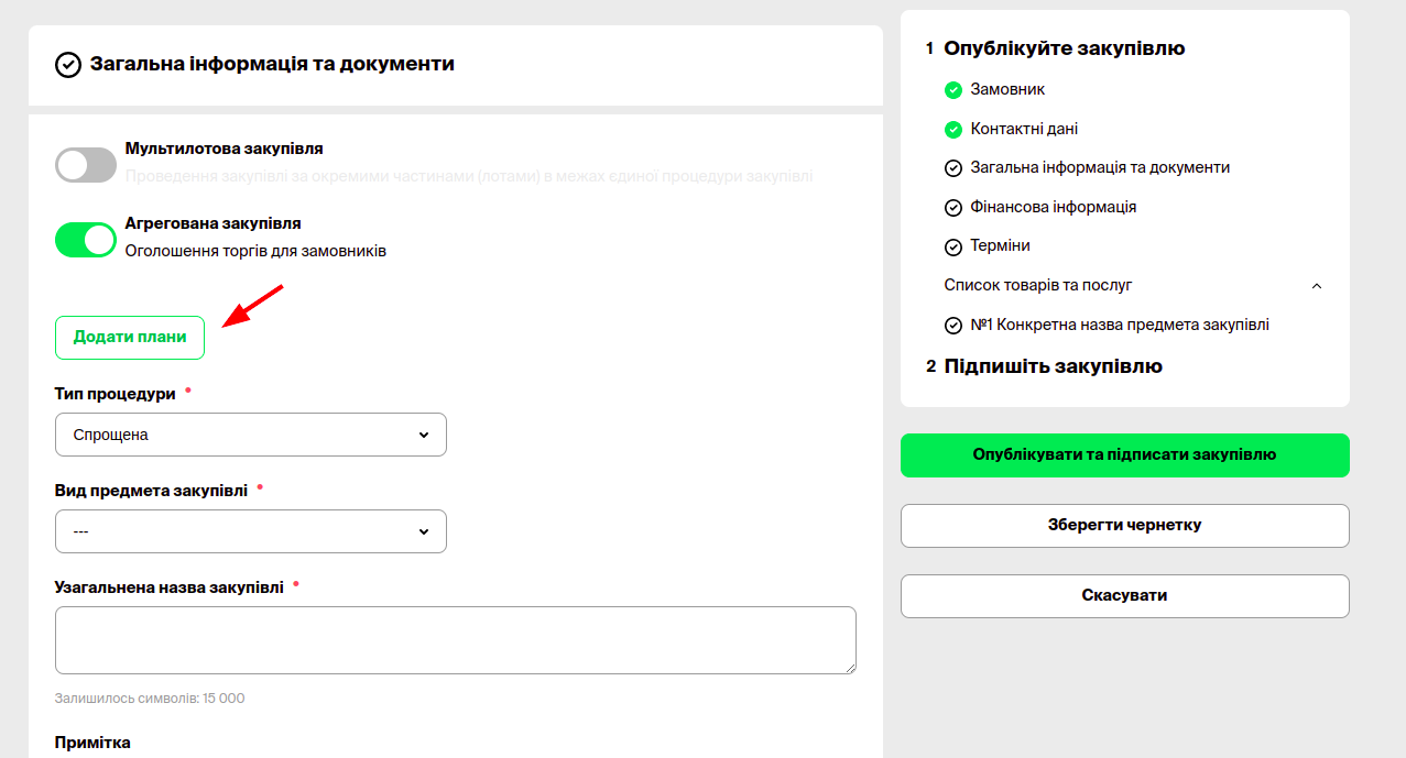 16. Після збереження чернетки закупівлі додайте потрібні плани через кнопку “Додати плани“.