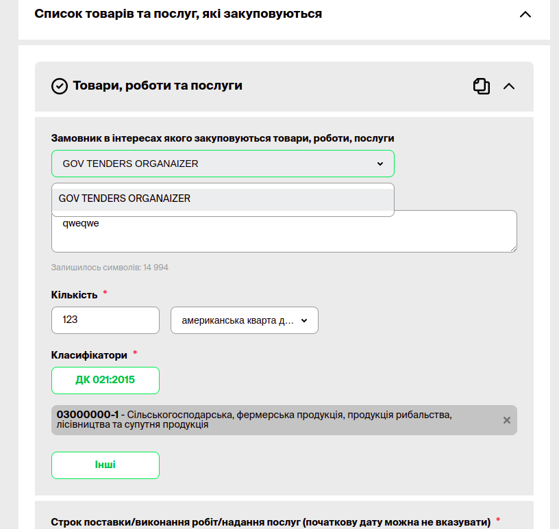 Далі заповнюємо необхідні поля у формі створення закупівлі, обираємо замовників, для яких закуповуємо.