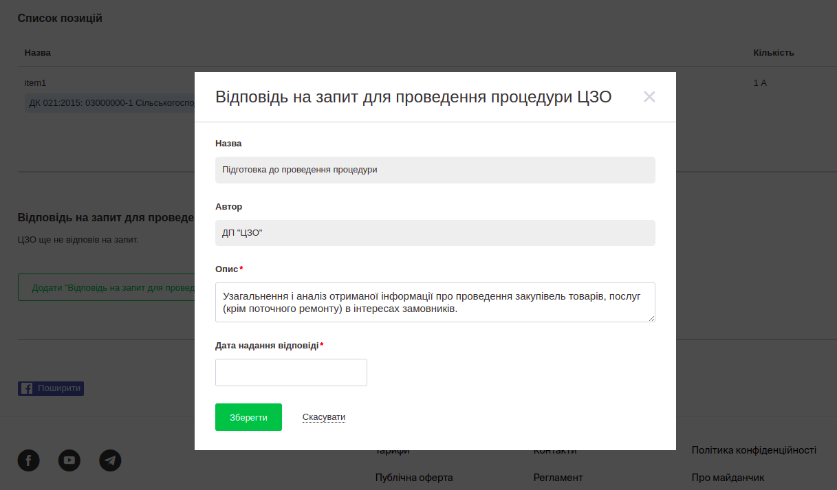 4. При кліку на кнопку “Додати “Відповідь на запит для проведення процедури ЦЗО” з’являється додаткове вікно в якому є кілька активних полів.