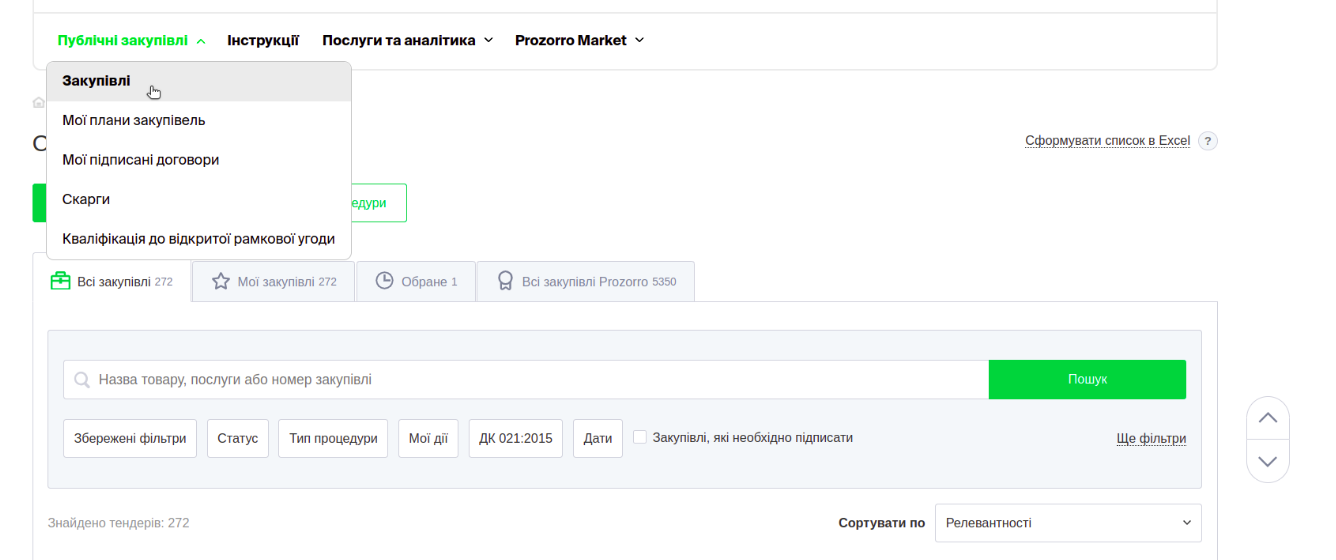 1. Для оголошення закупівлі перейдіть у розділ “Публічні закупівлі” – “Закупівлі” на майданчику.