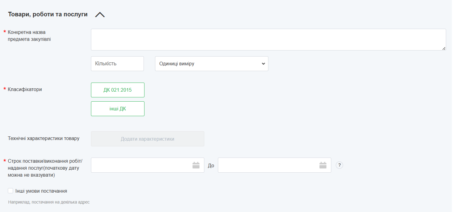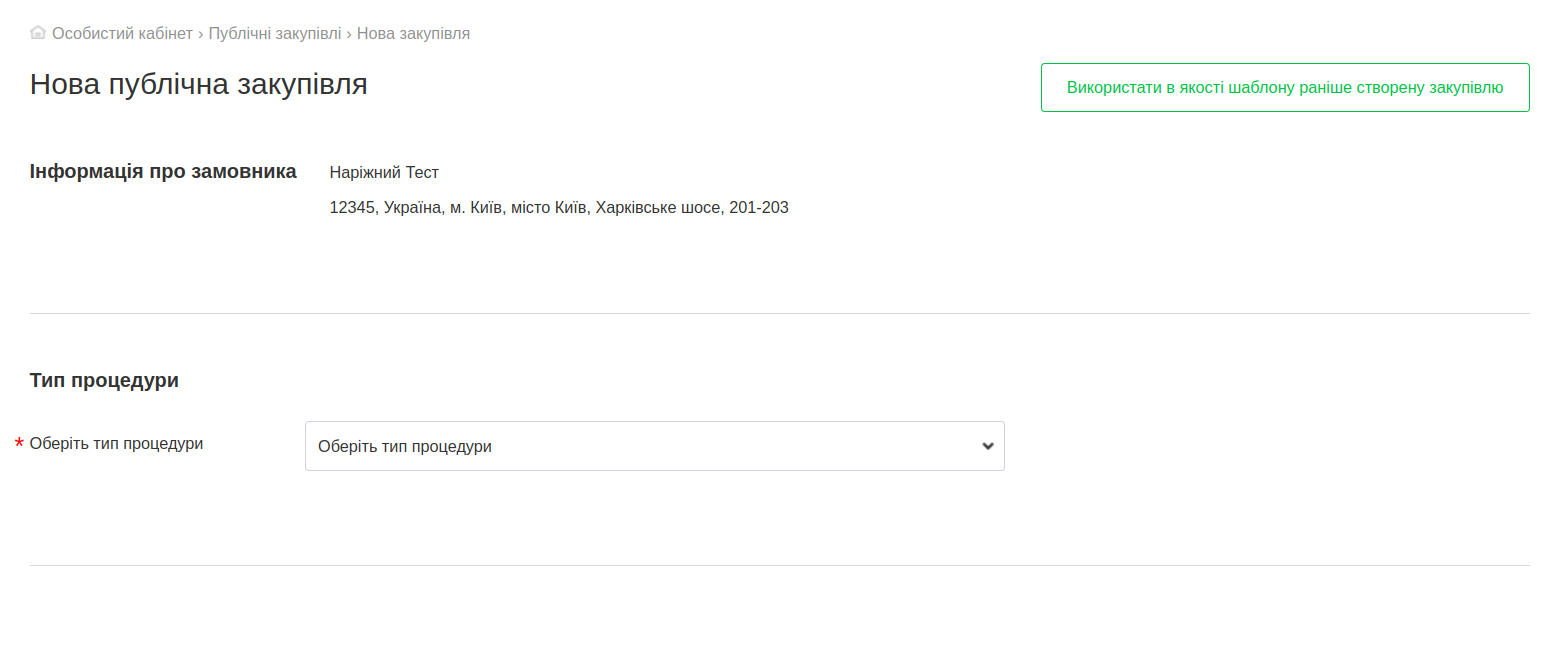 3. Після цього відкриється форма для оголошення нової закупівлі.