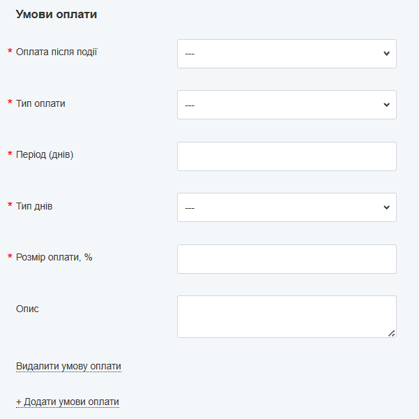 Якщо в полі “Оплата після події” ви виберете варіант “інша подія”, то для більш розширеного інформування постачальників поле “опис” необхідно заповнити. Якщо, наприклад, у вас передбачено аванс і післяоплата, тоді створіть ще одну умову (кнопка “Додати умови оплати”) та заповніть обидві таблиці. Сумарний відсоток по всім видам оплати повинен дорівнювати 100%:
