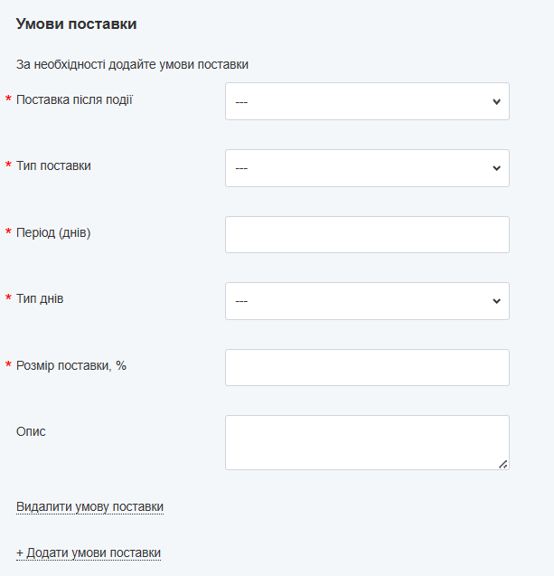 За потреби вкажіть умови поставки: після якої події здійснюється поставка, її тип, період поставки, тип днів та розмір поставки. Якщо умов поставки декілька, важливо пам’ятати, що сумарний відсоток по всіх умовах поставки повинен бути 100%.