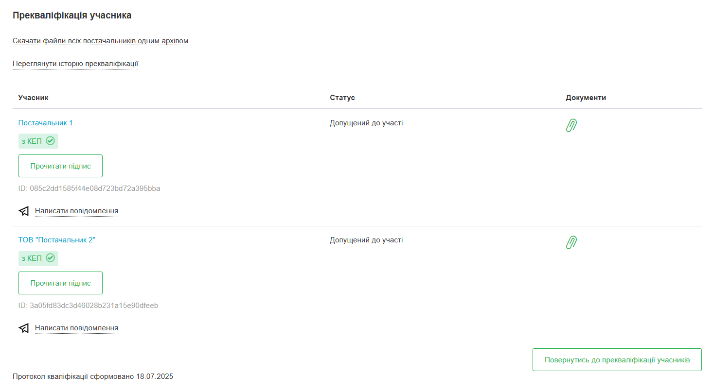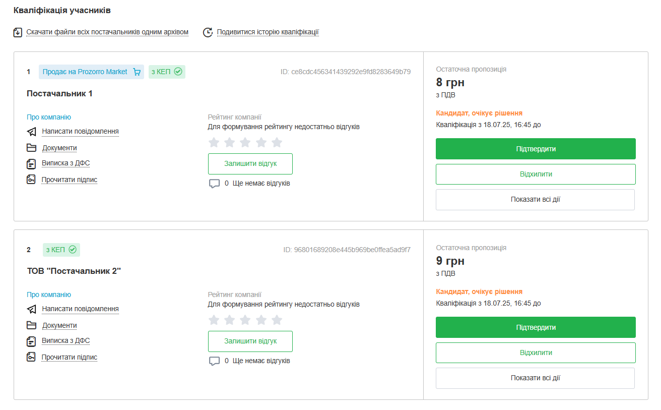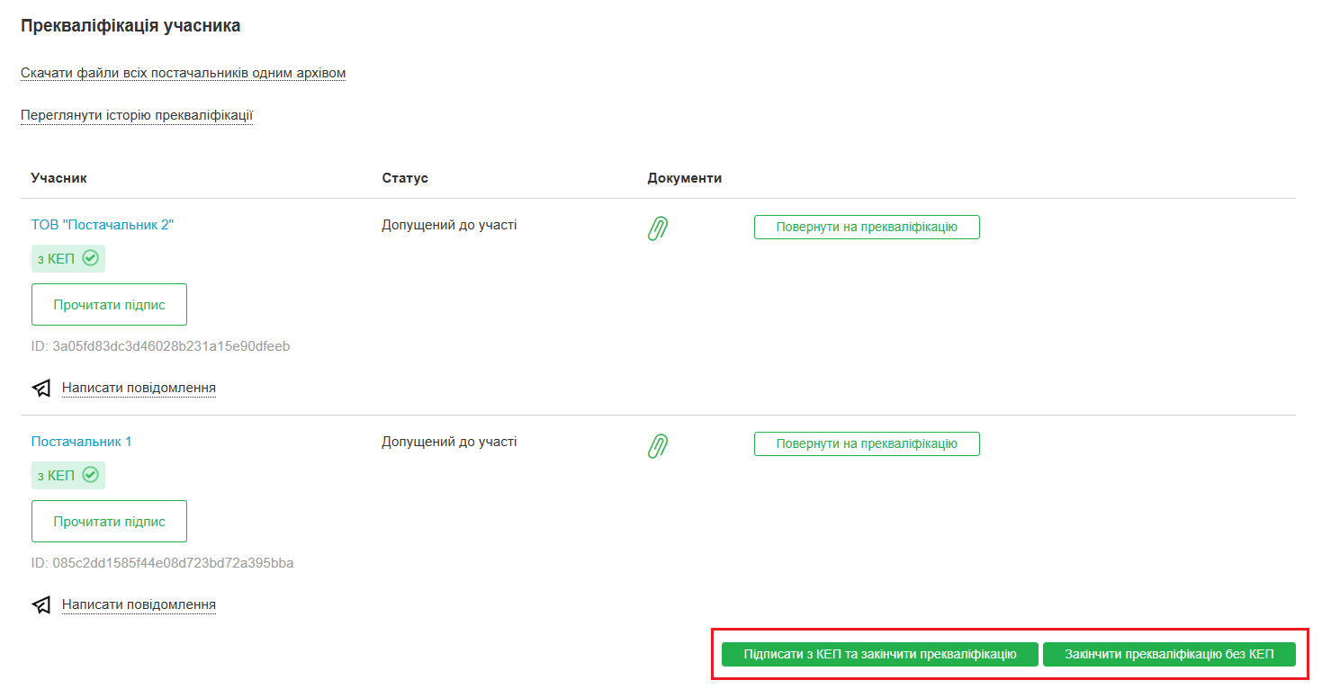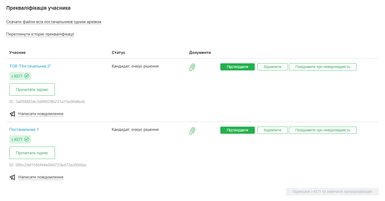 Замовник приймає рішення щодо допущення кожного з учасників до аукціону. Після розгляду всіх пропозицій у замовника є можливість підписати рішення КЕП або закінчити прекваліфікацію без КЕП.