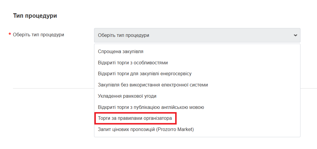 4. Виберіть тип процедури закупівлі “Торги за правилами організатора”