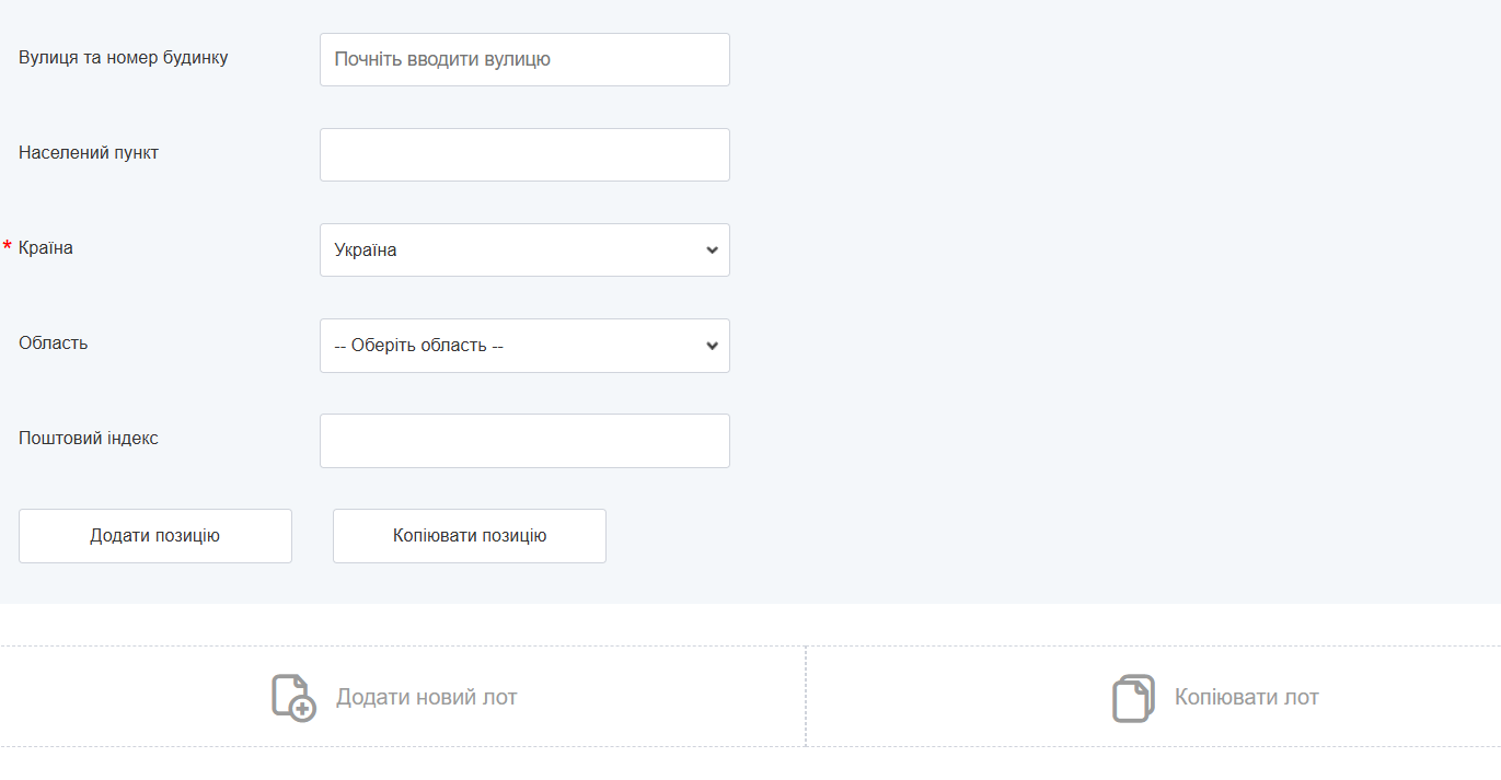 Якщо у вас декілька лотів – ви можете додати їх натиснувши відповідну кнопку “Додати новий лот” або “Копіювати лот”, тоді інформація автоматично буде скопійована з попереднього лоту. Вам залишиться лише відредагувати необхідні дані.