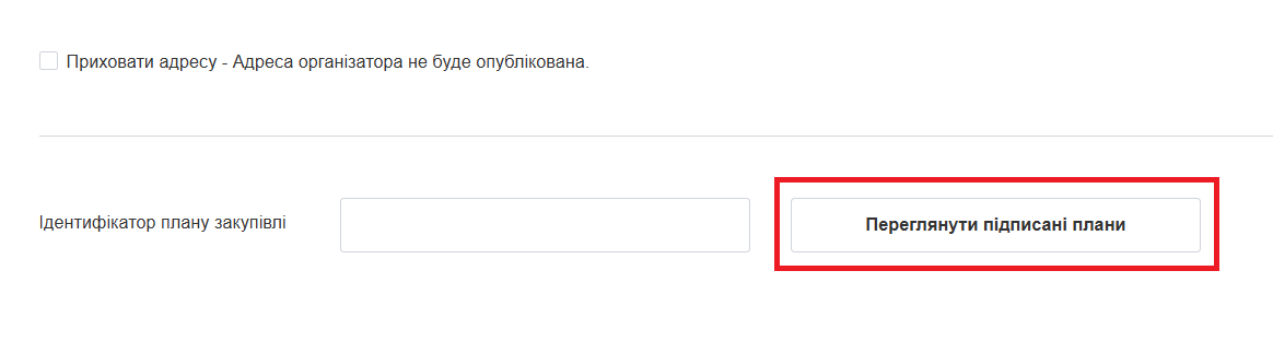 Зазначте ідентифікатор плану вручну або натисніть “Переглянути підписані плани”. Виберіть необхідний план зі списку. Це поле не обов’язкове до заповнення, якщо донором не передбачено створення замовником плану.
