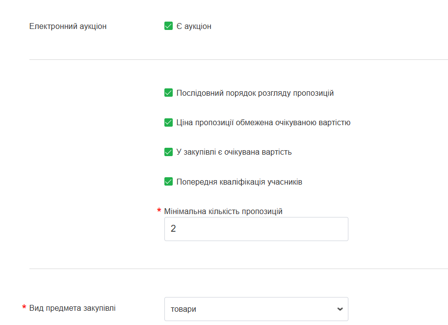 - “Послідовний порядок розгляду пропозицій” – означає, що розгляд пропозицій відбуватиметься в порядку зростання цін. Якщо прибрати галочку, то замовник може їх розглядати у будь-якому порядку.