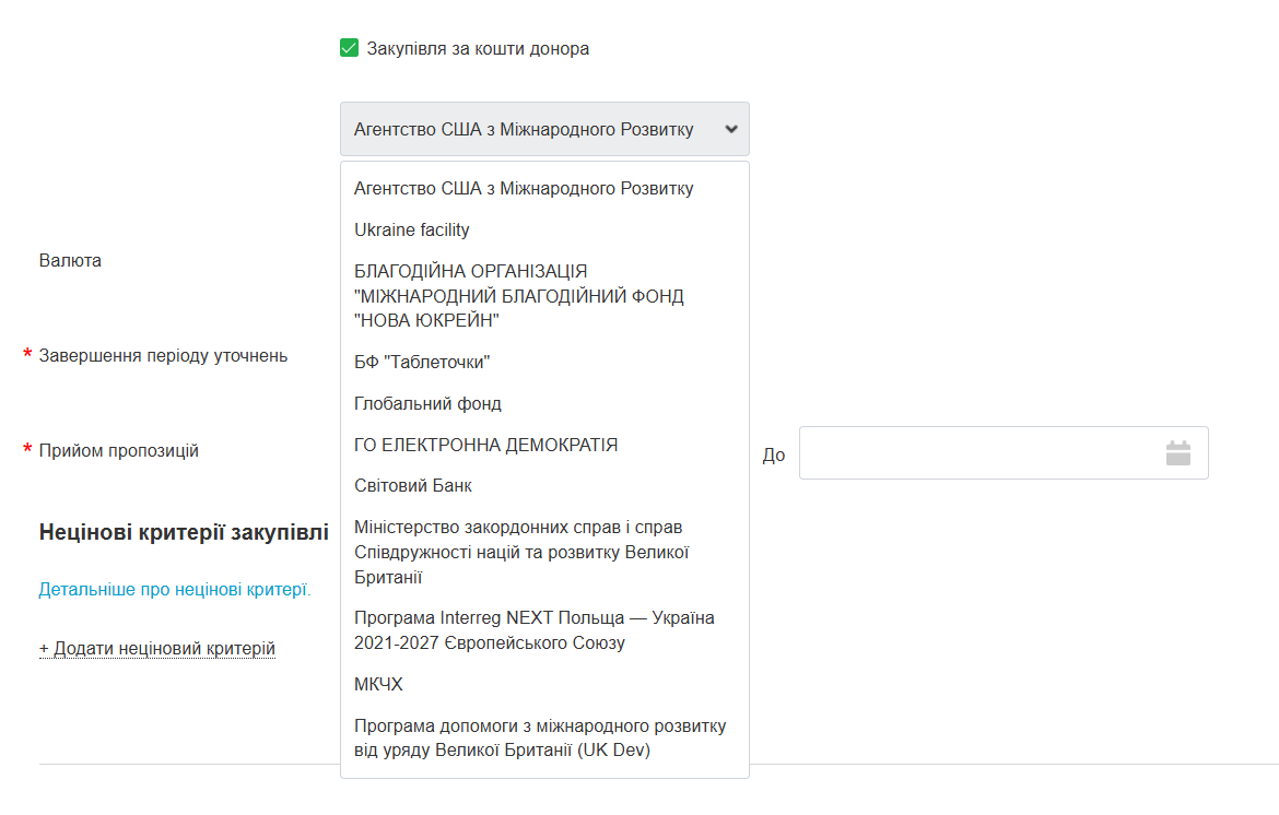 9. У разі проведення закупівлі за кошти донорів увімкніть галочку “Закупівля за кошти донора” та виберіть необхідного донора із випадаючого списку.