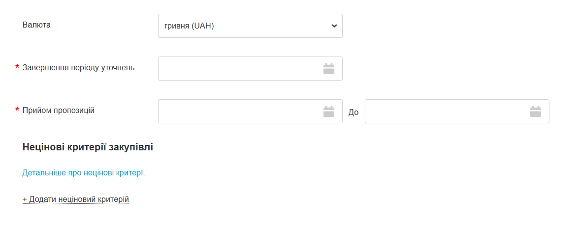 Вкажіть дату завершення періоду уточнень (не менше 3 к.д.) та терміни прийому пропозицій (не менше 4 к.д.). За потреби зазначте нецінові критерії закупівлі.