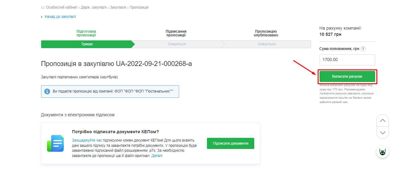 If your personal account balance is insufficient to submit the proposal, click “Issue Invoice” and pay it.