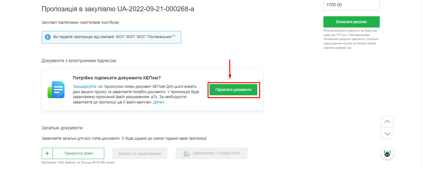 1. Go to the supplier’s personal account on the Zakupivli.Pro platform.