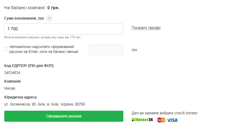 При оплаті обов’язково вказуйте ID особистого кабінету та назву компанії. Це пришвидшить відображення платежу на балансі компанії.
